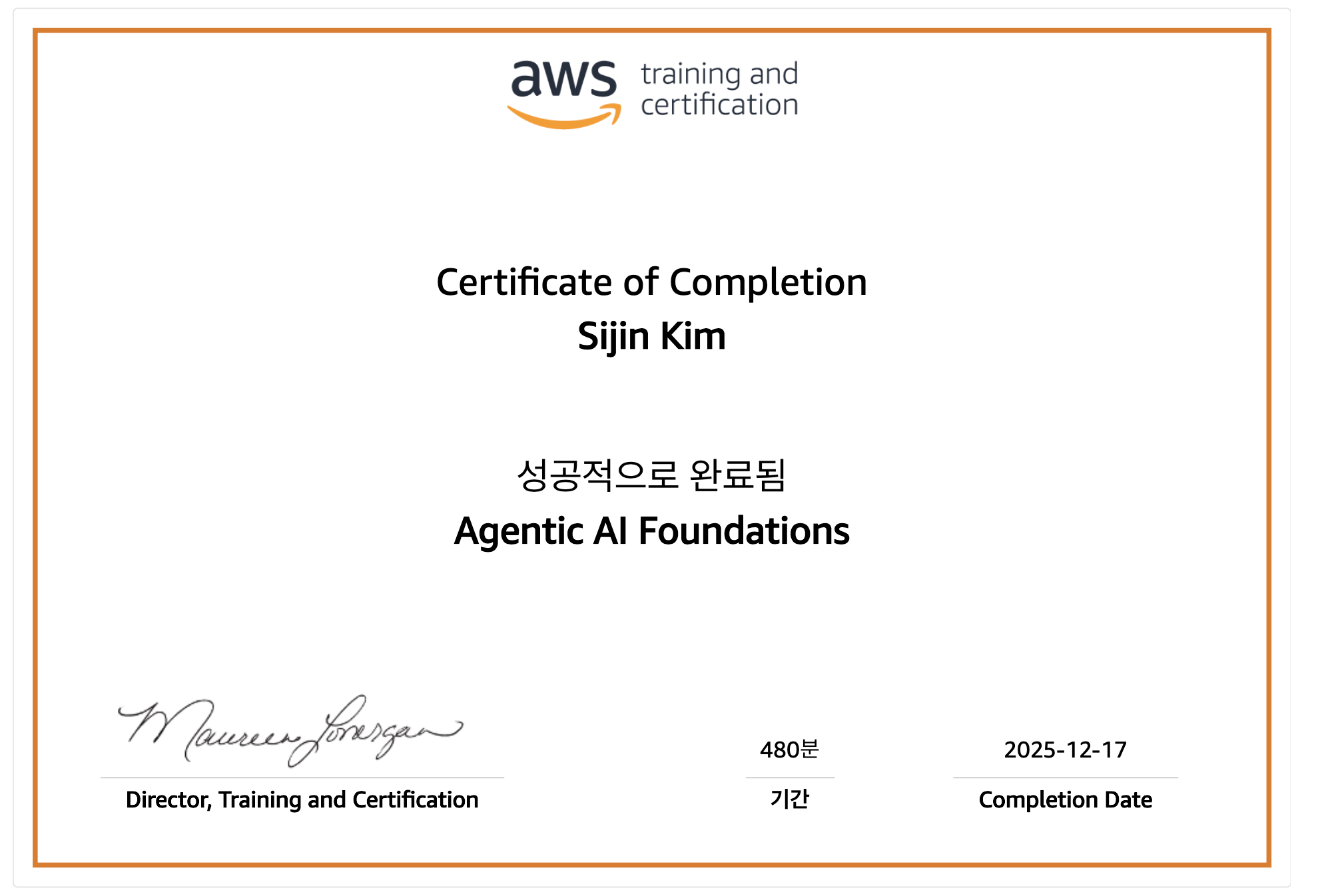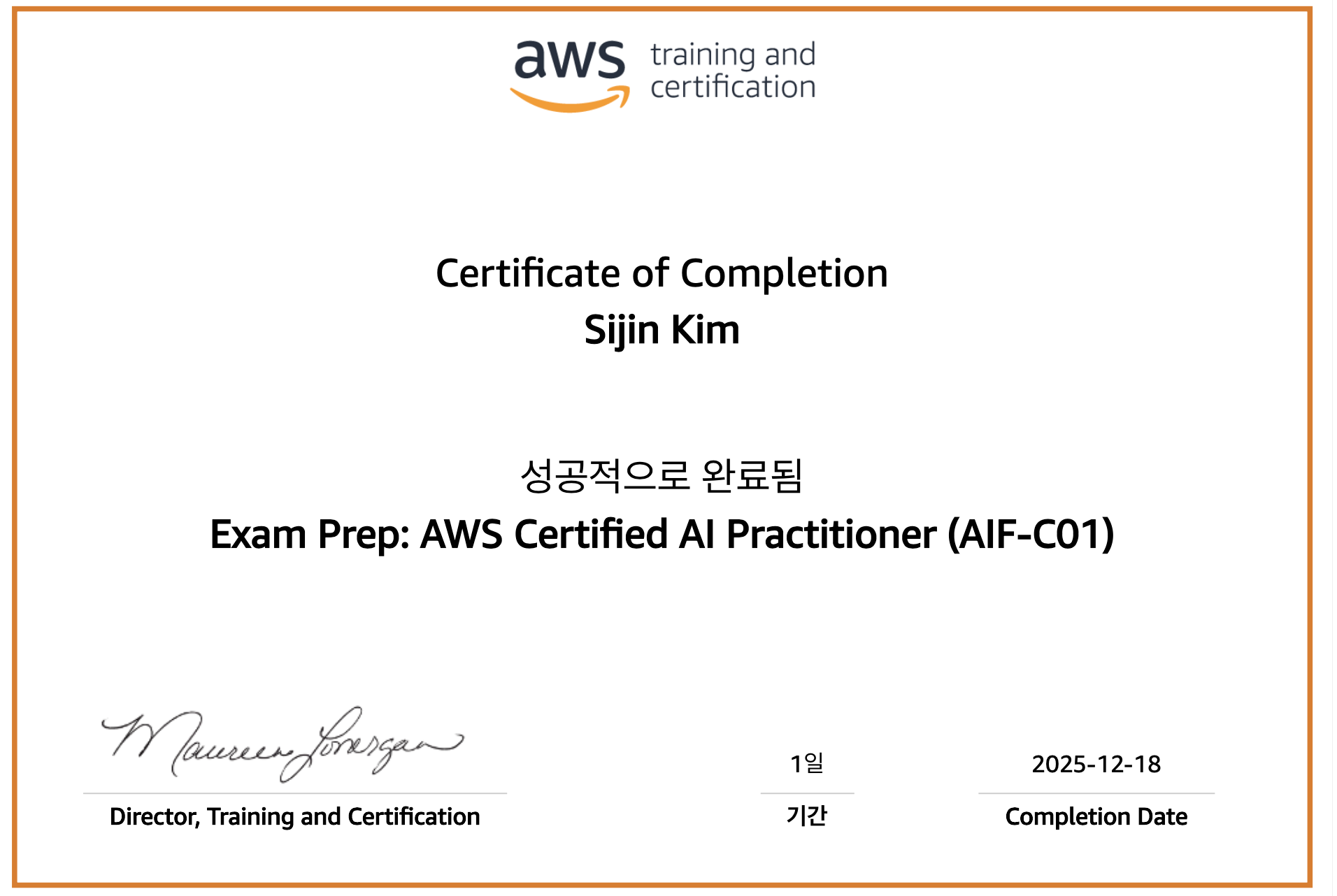 다음은 AWS AIF-C01 교육 수료증이다.